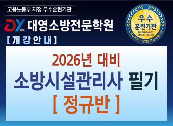 ![[주말] 소방시설관리사 [필기이론][10월19일(일)]개강 > 국비지원교육 개강일정 | 대영소방전문학원](http://www.dyedu.co.kr/theme/dy/html/image/top_logo.png)